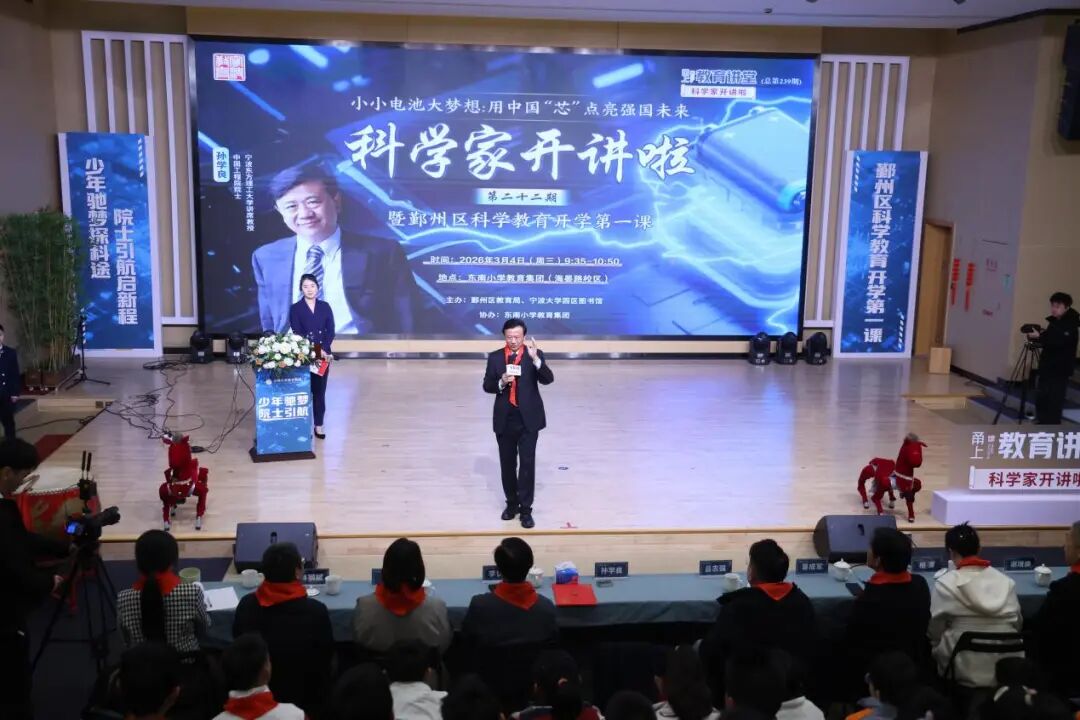 3月4日,宁波东方理工大学讲席教授、中国工程院外籍院士孙学良走进宁波市鄞州区东南小学,带来“科学家开讲啦”第22期讲座《小小电池 大大梦想:用中国“芯”点亮强国未来》,也是鄞州区科学教育开学第一课。