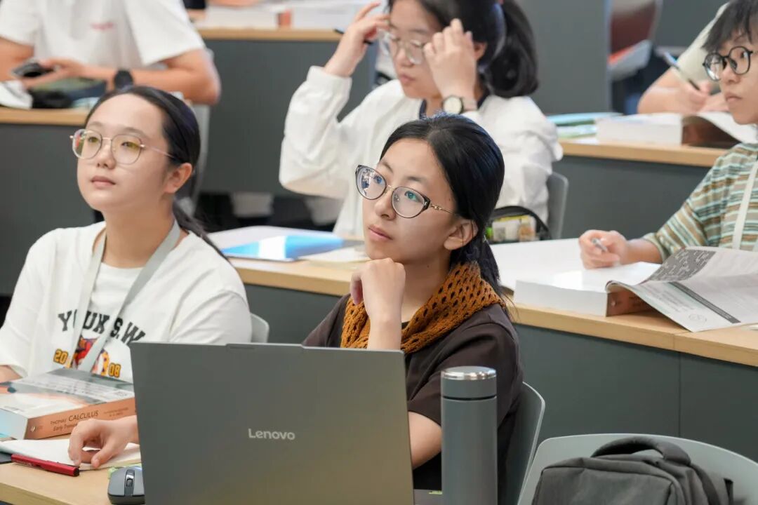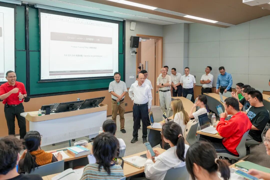 今天的第一堂课是《高等数学I》。在正式上课前,校长陈十一、党委书记金波、常务副校长兼教务长张东晓等校领导一行走进教室。在教学实验楼的两个平行课堂里,两位讲席教授——沈捷与王晓明,即将引领着学生们进入微积分的深邃世界。陈十一校长与沈捷、王晓明两位教授亲切交流,了解课程准备情况,并与学生互动,勉励他们打好坚实基础。