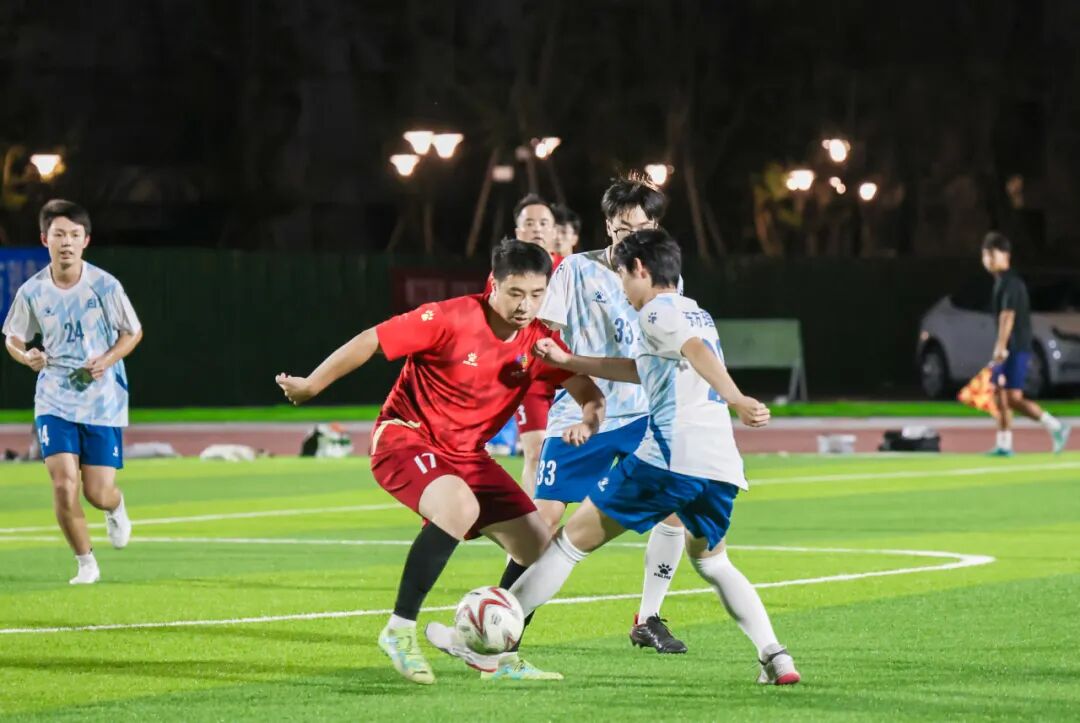 我校常务副校长兼教务长张东晓为比赛开球。比赛于晚上7点在学校足球场正式鸣哨开打。开场阶段,双方迅速进入白热化对抗状态。上半场,学生联队24号朱俊豪率先攻入一球。下半场,教职工队24号王超振成功扳平比分。常规时间内,两支队伍势均力敌,最终,以11的比分拖入了点球大战。